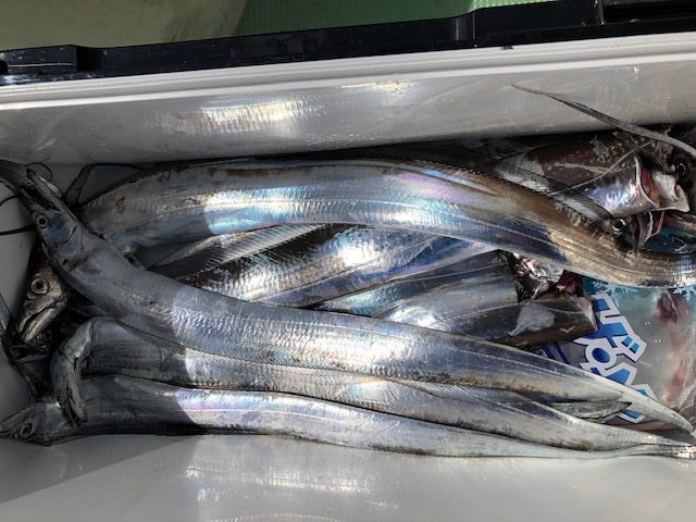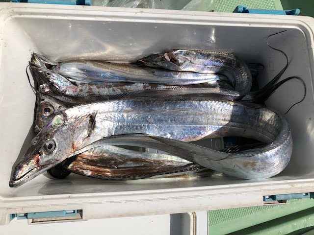 9月13日日曜日、タチウオで6時出船、天候曇り小潮、ポイントに着きベイト沢山有り釣り始めは当たり少なく 最初のヒット!はドラゴン8そこからは皆さんやる気満々‼ ぽつぽつヒット!潮終わる2時間前から入れ食い状態に天候も涼しく楽しい一日でしたね!釣果、ドラゴン8、ドラゴン6、他指3~4.5船中50~60匹。