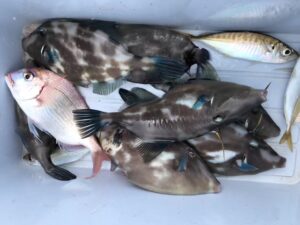 7月15日月曜日 五目釣りで6時出船、天候曇り時々小雨、長潮、今日は大雨の予報心配しましたが涼しくて大雨に合わずよっかたですね。前半ウマズラの当たり有りいい人で7匹後半潮動かず喰い渋く残念😆釣果 馬ズラ、真鯛、チダイ、グチ、ガシラ、アジ等々。