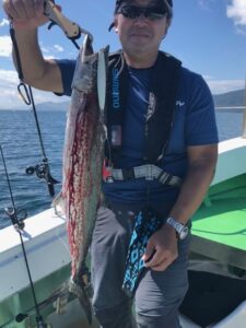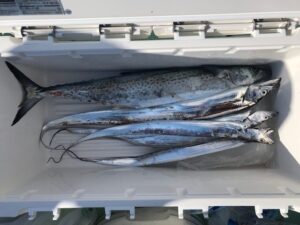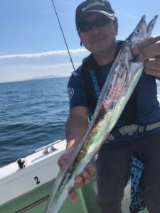 10月5日日曜日 タチウオ釣りで6時出船天候晴れ、大潮、今日は昨日3名そろいましたので急遽出船決定近海でもと言う事で人数少ないので釣り方仕掛け皆さんの自由に楽しんでください👍釣果は竿頭本命タチウオ4匹、サワラ1匹。14時納竿させて頂きました。
