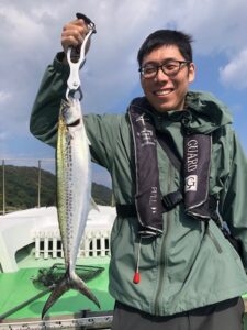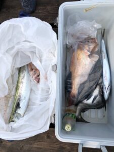 10月27日月曜日 ライトジギングで6時出船天候晴れ、小潮、今日はいつも楽しく釣り仲間の常連さん初参加の方々の貸切で出船沖は少し波高く波の弱いポイント選択させて頂きました。少し喰い悪く何とか人数分確保することできましたね😅釣果船中 真鯛3匹、サゴシ4匹、ヤズ1匹、クロダイ5匹、サバ1匹。14時30分納竿させて頂きました。