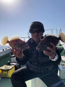 1月17日土曜日 カワハギ釣りで5時30分出船天候晴れ、中潮、今日は久しぶりに天候に恵まれ出船出来てよっかたです‼ 少し延長しましたお疲れ様でした。釣果 トップ2人9匹。